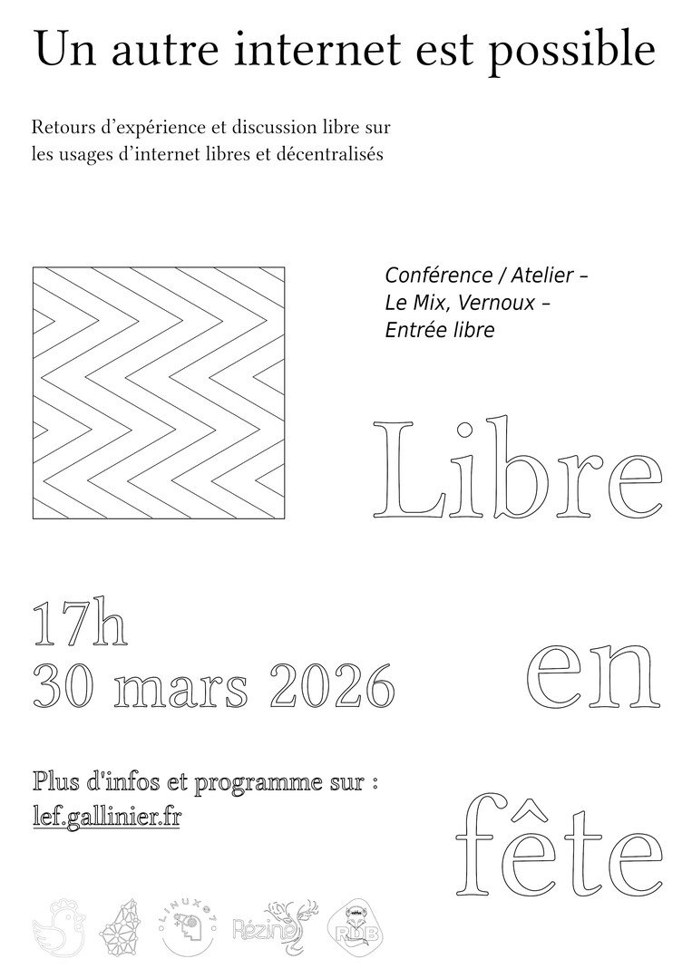 Cette année nous célébrons Libre en Fête, fête nationale du Logiciel Libre, avec plusieurs acteurs de nos contrées : La Fabritech, Gallinier, Rézine, RDB, Linux07, et des sympathisant du Logiciel Libre avec divers événements du 30 Mars au 4 Avril.